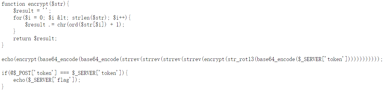 发现是一段加密代码,将flag加密了,根据前面的代码可以知道需要对那段字符串解密得到token,然后post回去才能拿到flag