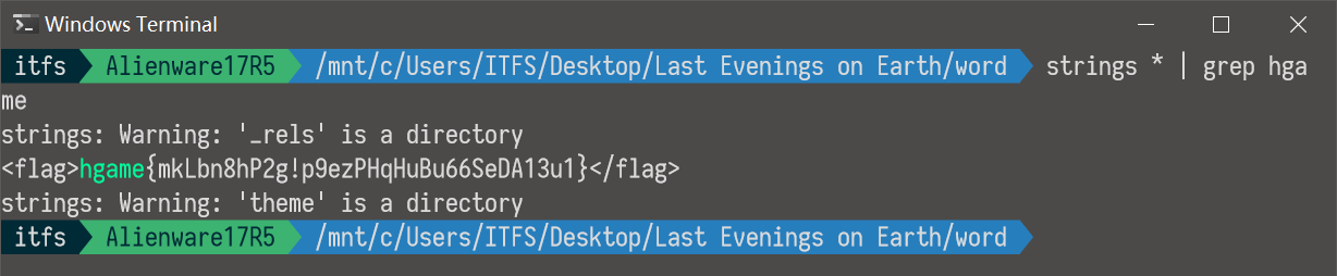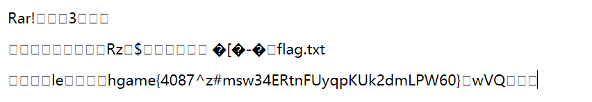 解压后是一个doc,里面是篇小说,没有找到隐藏文字,于是把这个文件解压, 搜索字符串hgame,拿到flag