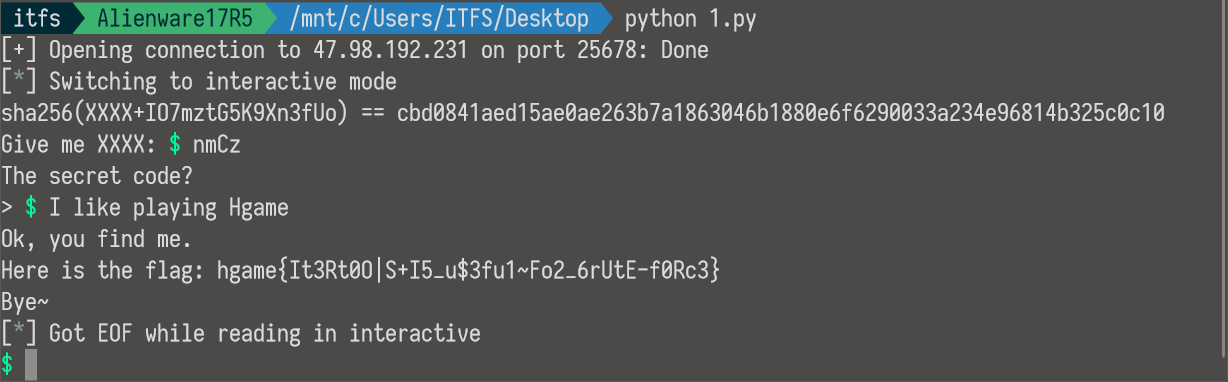 看起来需要找到所给字符串的前四位,用了sha256算法,然后输入I like playing Hgame即可